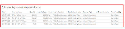 Date, Product, Quantity, Source & Destination Locations, Transfer Type, Reference, Transferred By