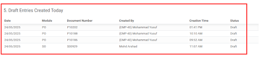 Spot and review all draft transactions across Sales, Purchases, and MRP that were created today.